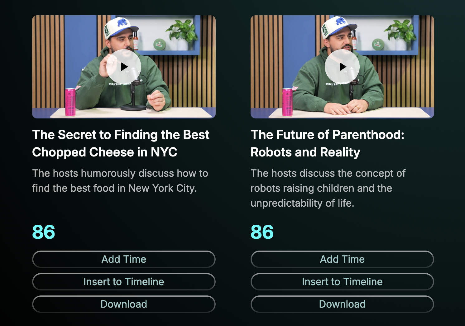HypeSpike works by taking your video and analyzing audio spikes, visual activity, and transcriptions to identify the most engaging moments. Once detected, those highlights are automatically clipped for you. From there, you can easily reclip if a moment feels cut short, or use the built-in tools to edit and reframe your content seamlessly.
